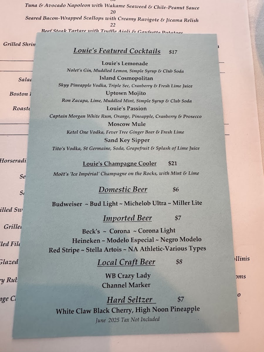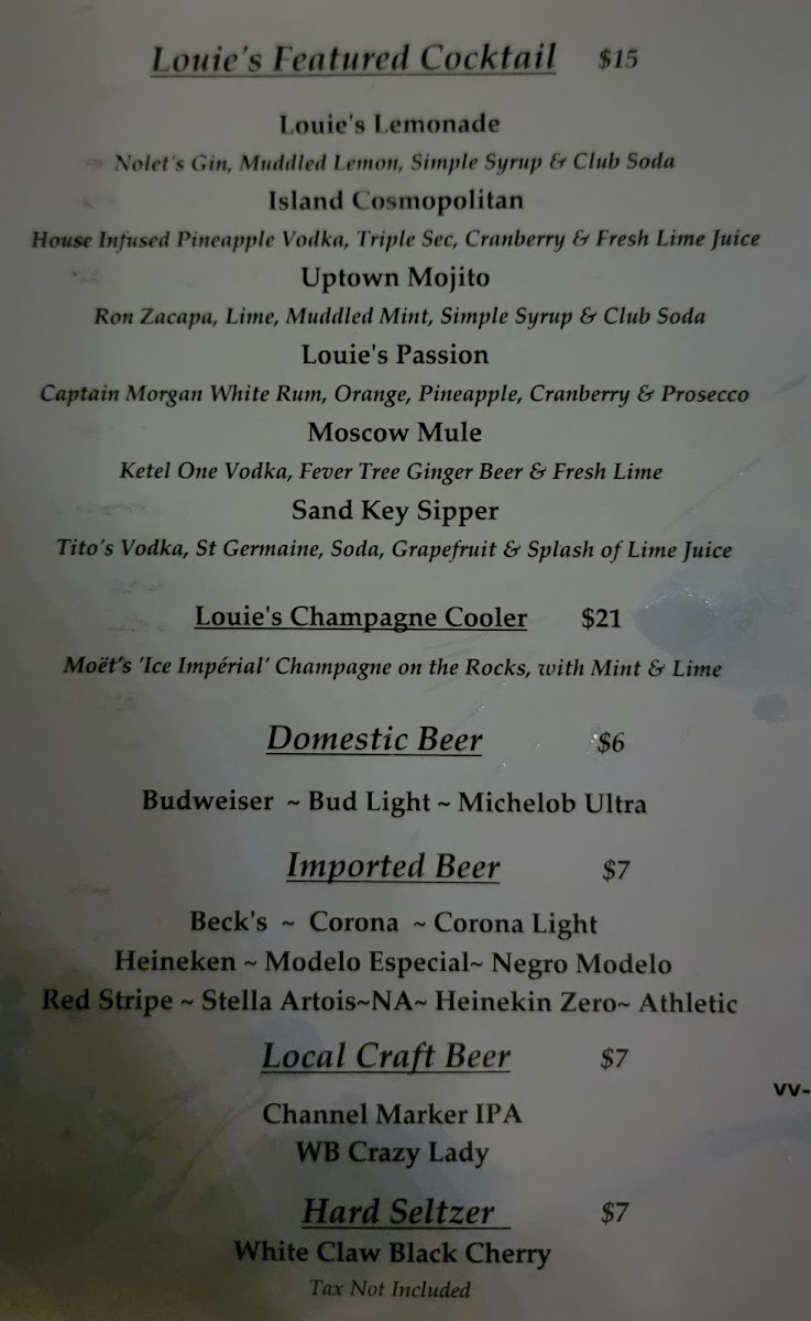 Drink options at Louie's are equally as enticing; guests can savor light and fruity cocktails like the Sand Key Sipper and Louie's Champagne Cooler, perfect for washing down those ocean-fresh meals on a sunny day.